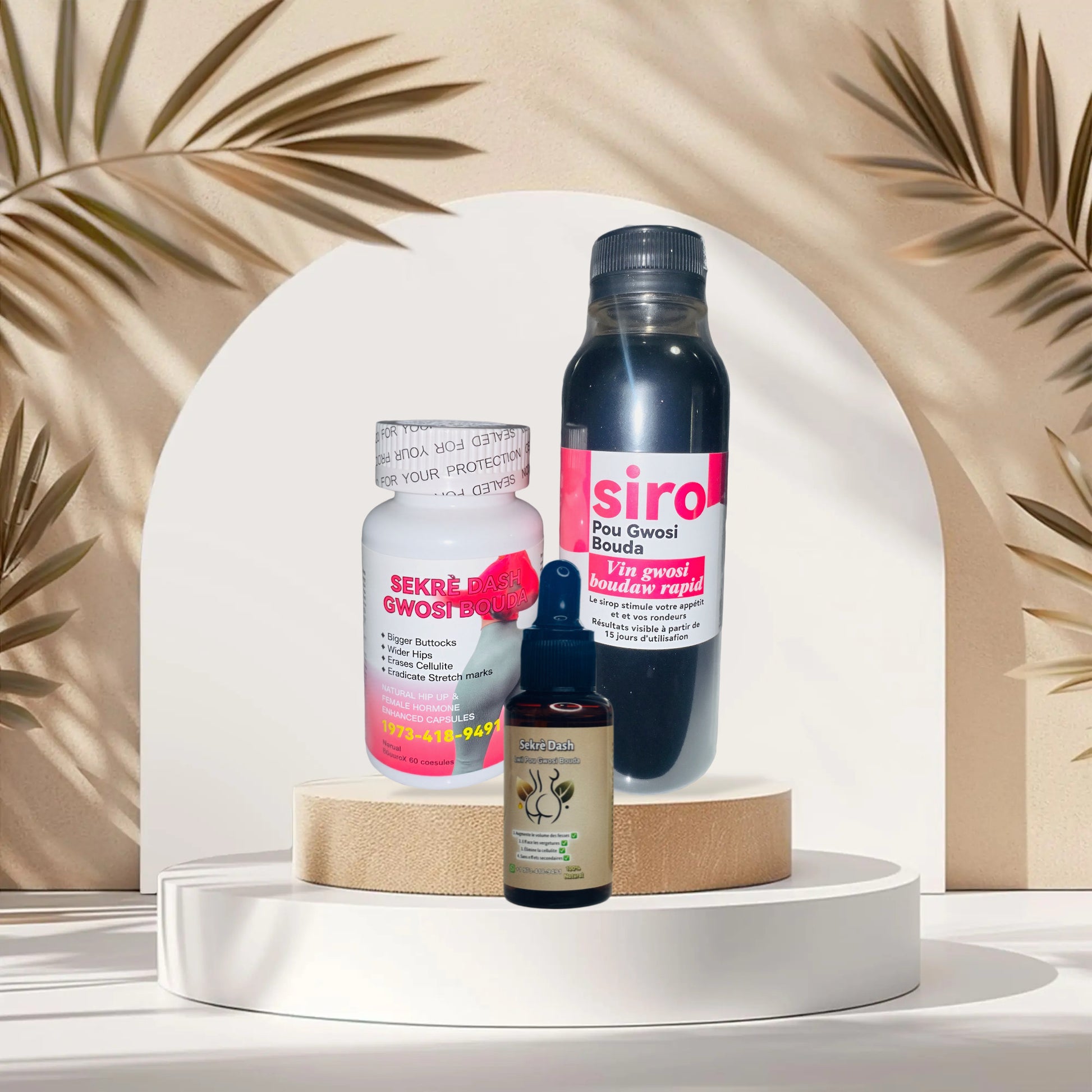 Transform your body naturally with the full power of Sekrè Dash’s signature 3-step system — an expertly formulated combination of BBL Capsules, Sculpting Syrup, and Butt Massage Oil. Each product targets a specific area of your beauty goals, working together to help you achieve fuller hips, a rounder, lifted booty, a flatter stomach, and smoother, tighter skin.
